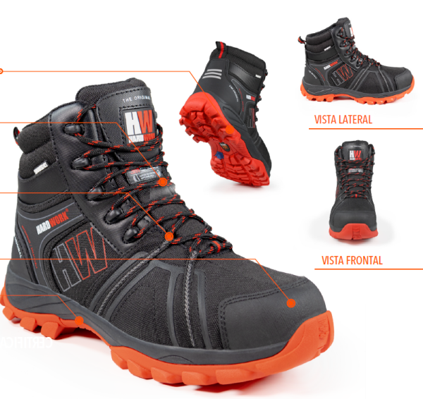 Calzado de seguridad de caña Alta (13,5 cm), diseñado para ofrecer comodidad, protección y rendimiento en cualquier entorno. Su plantilla interior de gel proporciona un confort superior, mientras que su diseño liviano y ergonómico asegura un uso prolongado sin fatiga. Además, incluye sobrepuntera y refuerzos laterales de goma, así como un detalle reflectante en el talón.